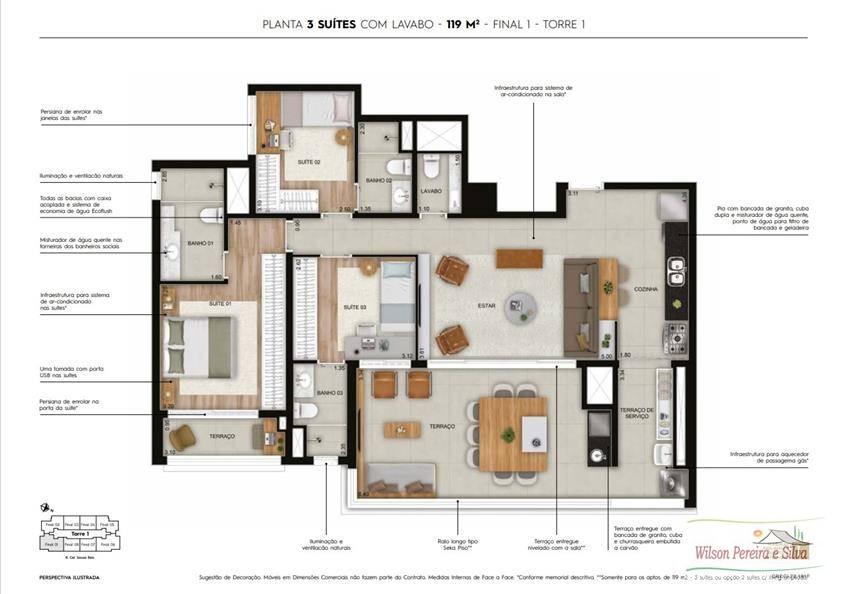 119m²- 03 suítes, varanda gourmet, lavabo. Opção de planta, 02 suítes, living ampliado. 02 vagas.