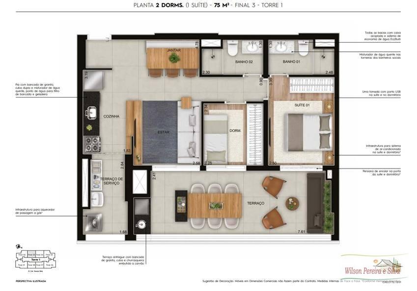 75m² à 76m²- 02 dormitórios, suíte, varanda gourmet, 01 vaga.