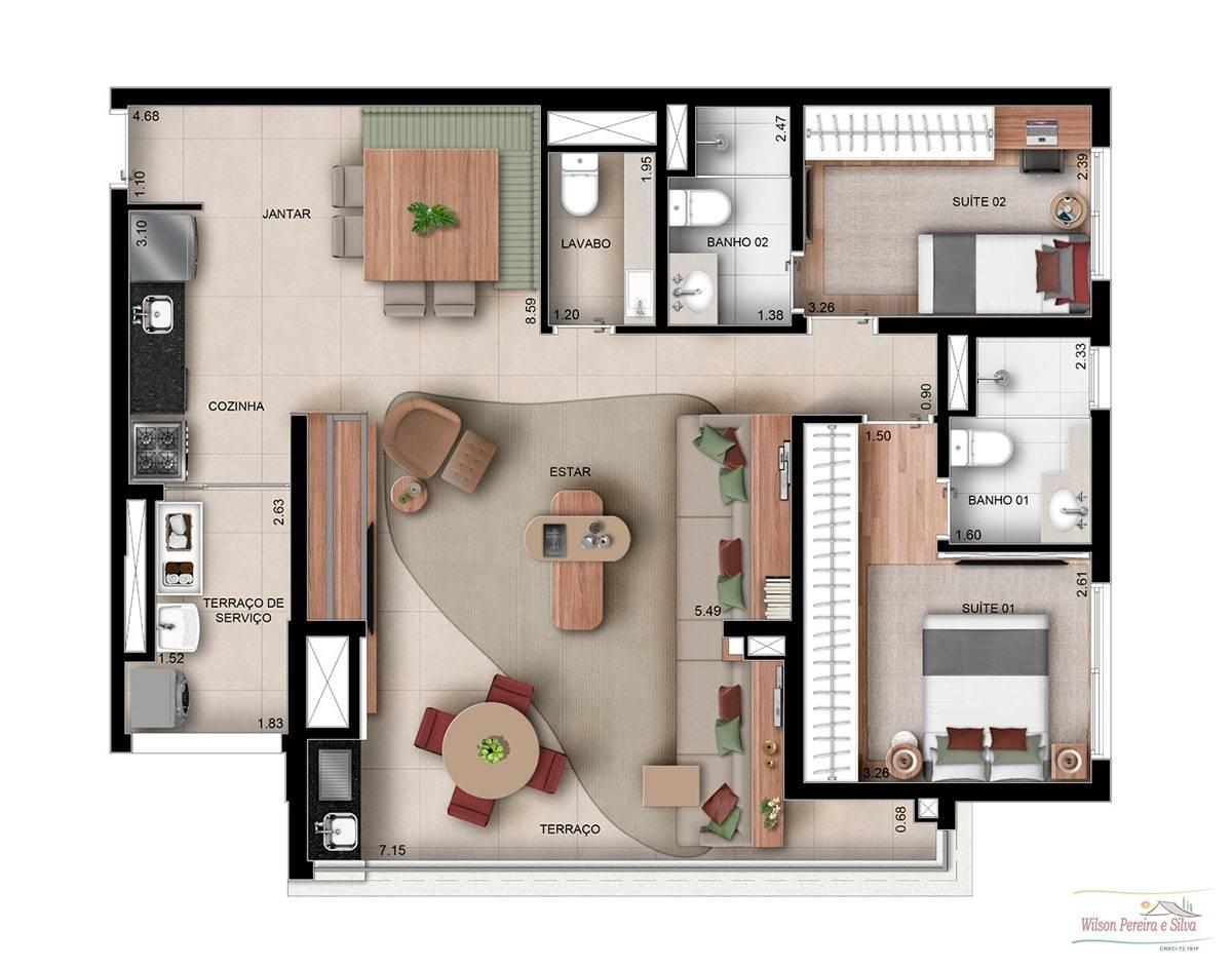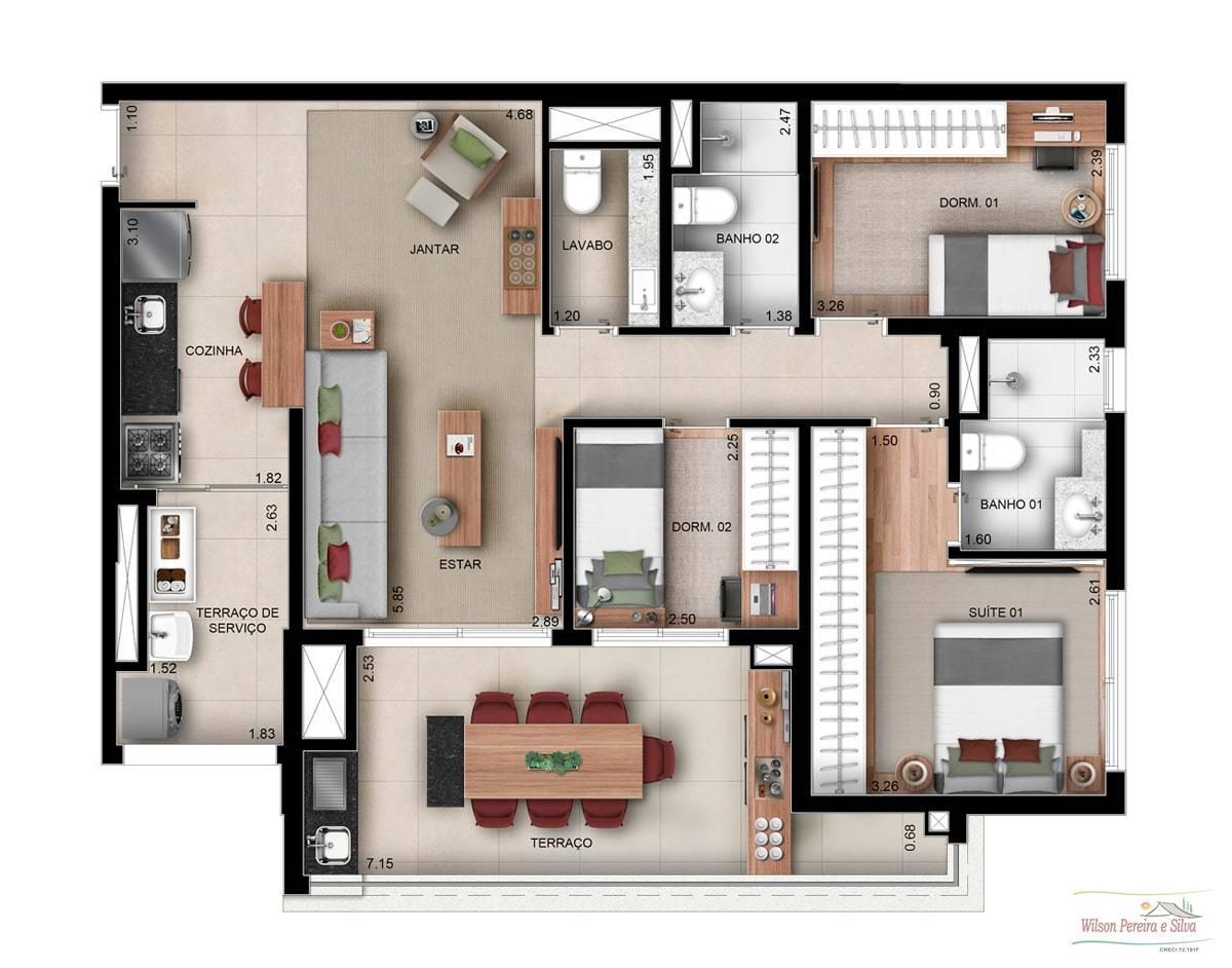 - 2 e 3 dormitórios (1 Suíte) de 2 e 3 quartos com suíte e terraço na churrasqueira